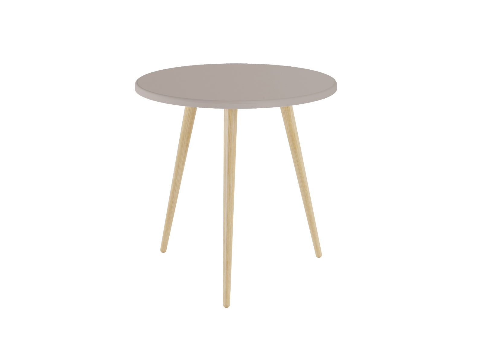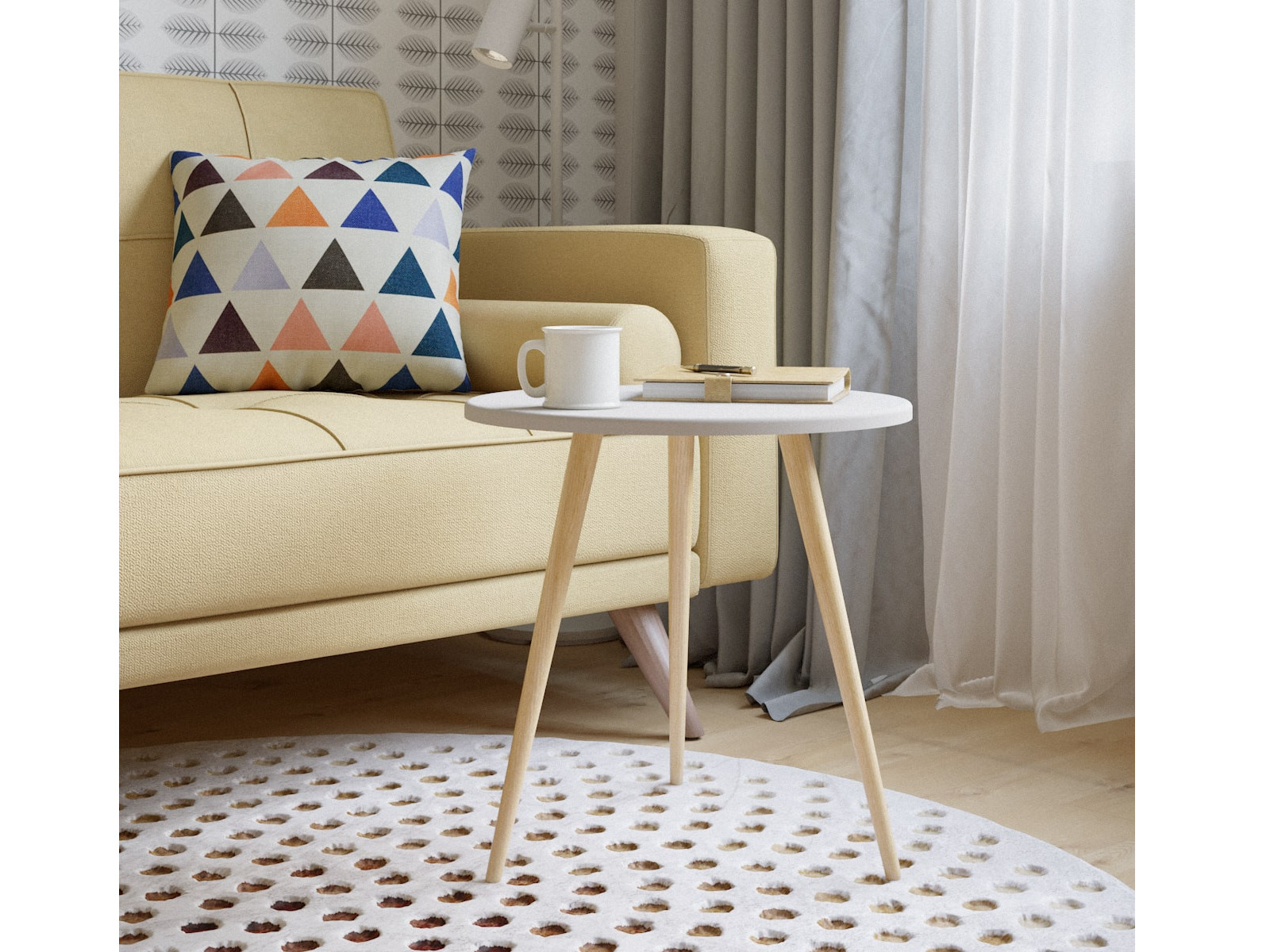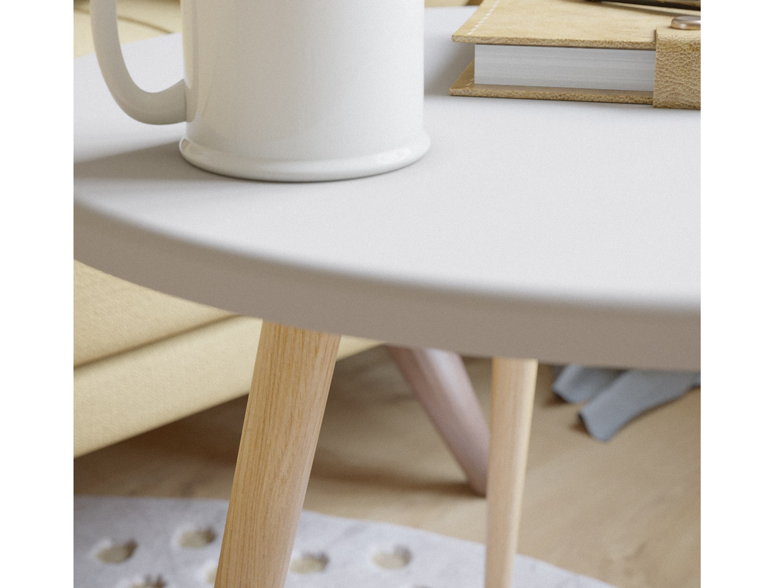 В дизайне использована простая геометрия столешницы в сочетании с деревянными опорами.