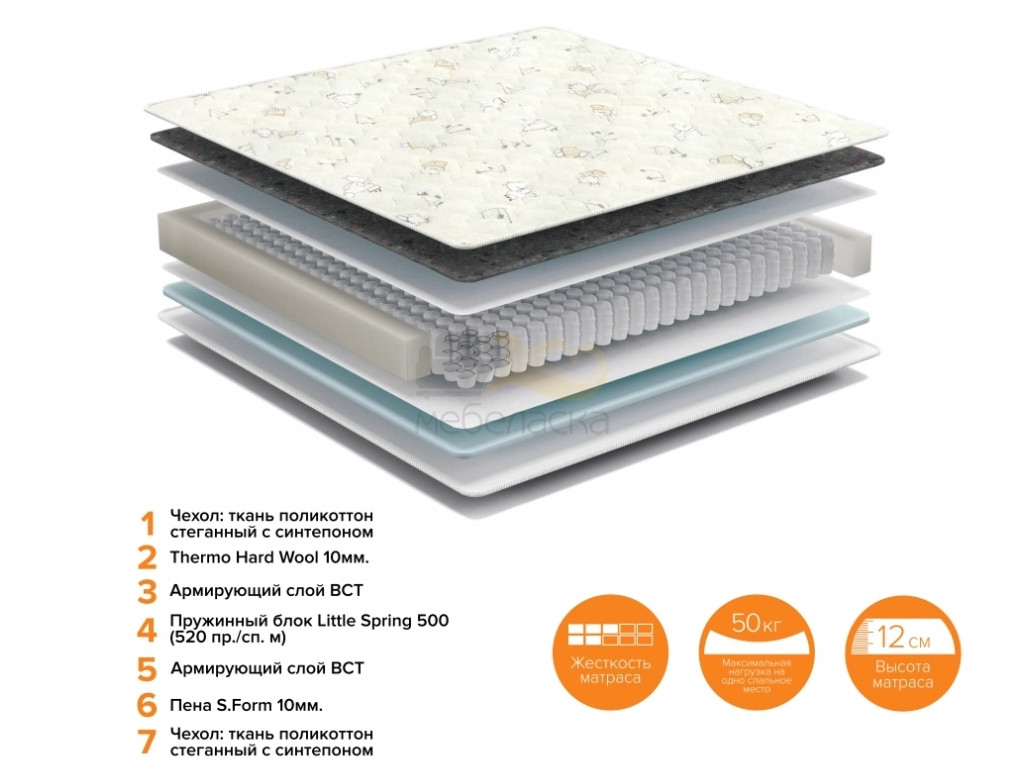 Наполнение : Независимый пружинный блок Little Spring 500 (520 пружин на спальное место) + высокопрочная специализированная ткань + термовойлок Thermo Hard Wool + ортопедическая пена
