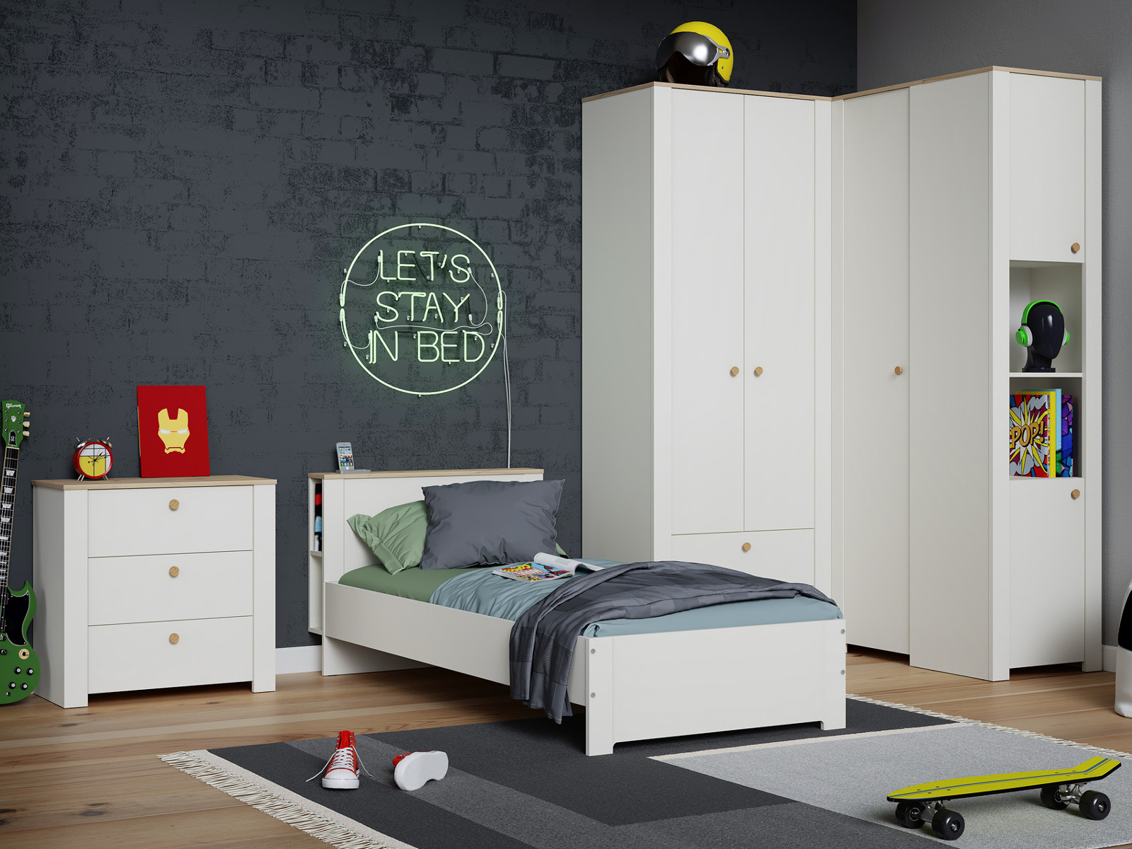 Цена за комплект: Комод 16.228.03, Шкаф для одежды 13.339, Шкаф угловой 13.229, Шкаф торцевой 16.306, Кровать 11.54