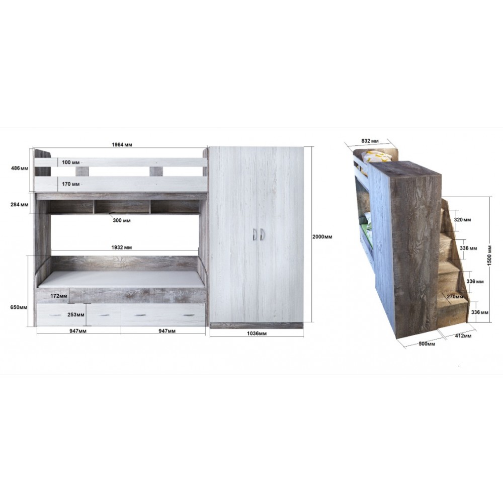 Цена указана за комплектацию на главном фото (каркас, шкаф, кровать нижняя, стол, лестница)