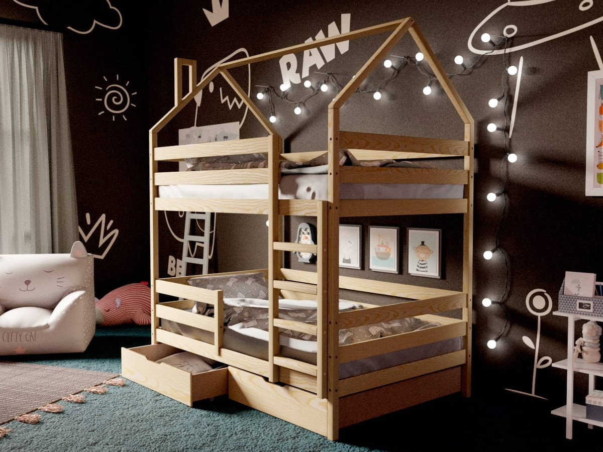 - Двухъярусная кровать-домик без покраски 80х160 см с ящиками
