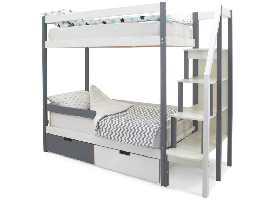 Двухъярусная кровать Svogen с ящиками и бортиком графит-белый