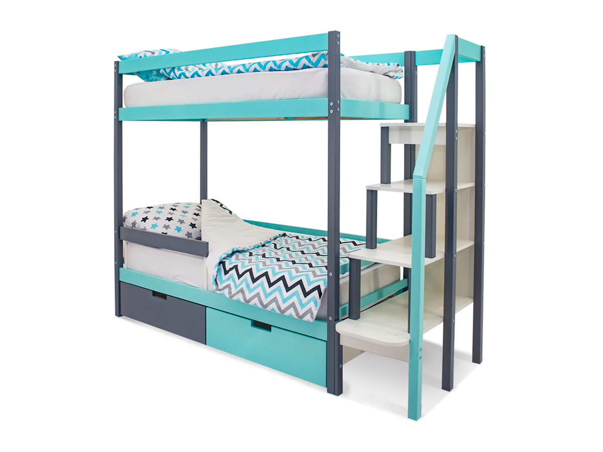 Двухъярусная кровать Svogen с ящиками и бортиком графит-мятный