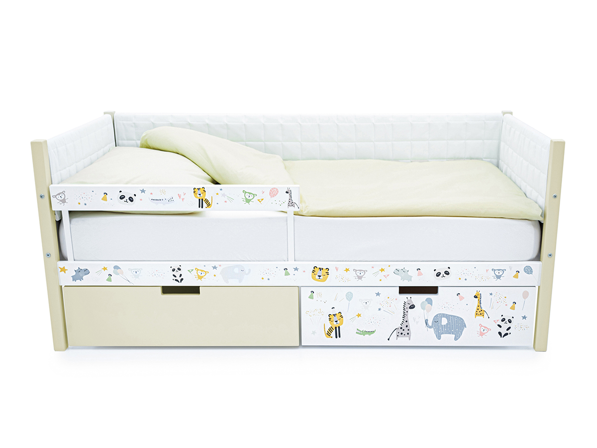 Кровать-тахта Svogen мягкая с ящиками и бортиком с фото бежевый/зверята