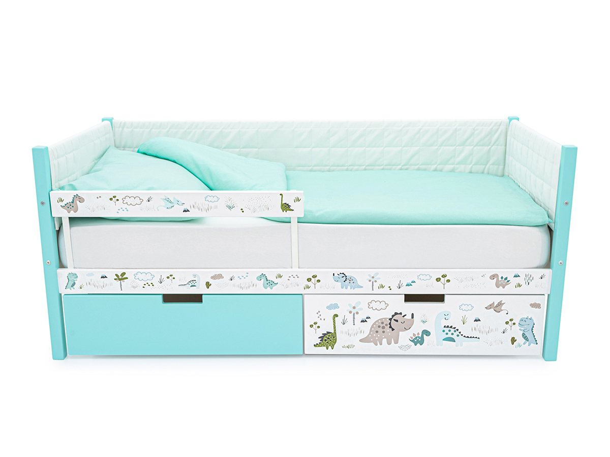 Кровать-тахта Svogen мягкая с ящиками и бортиком с фото мятный/динозаврики