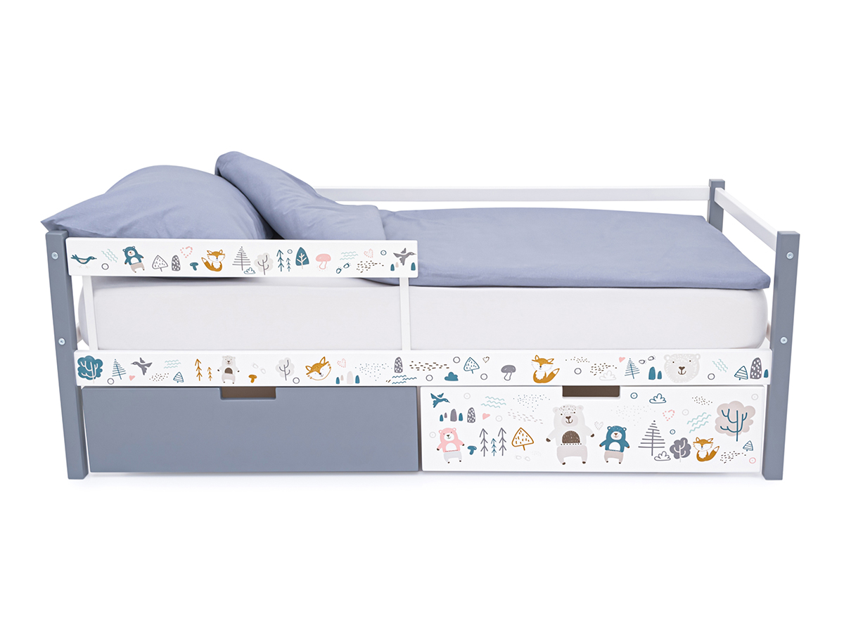 - Кровать-тахта Svogen с ящиками и бортиком с фотопечатью графит-белый/мишки