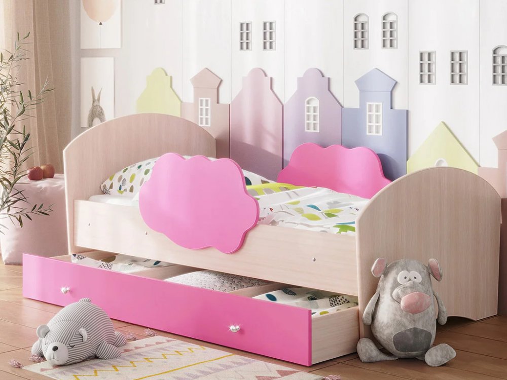 - Кровать Тучка с бортиками и ящиком дуб млечный с розовым