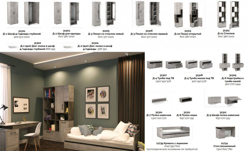 Цена за комплект: Д-4 Тумба под ТВ, Д-8 Полка-ниша (2 шт), Д-3л Пенал со стеклом левый, Д-3п Пенал со стеклом правый