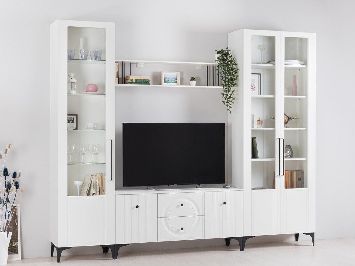 Цена за комплект: Шкаф 13.217, Шкаф-пенал 13.218, Тумба под ТВ 16.45, Полка 16.478