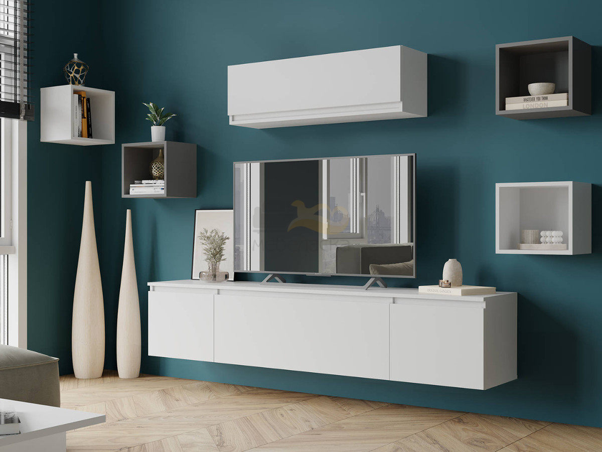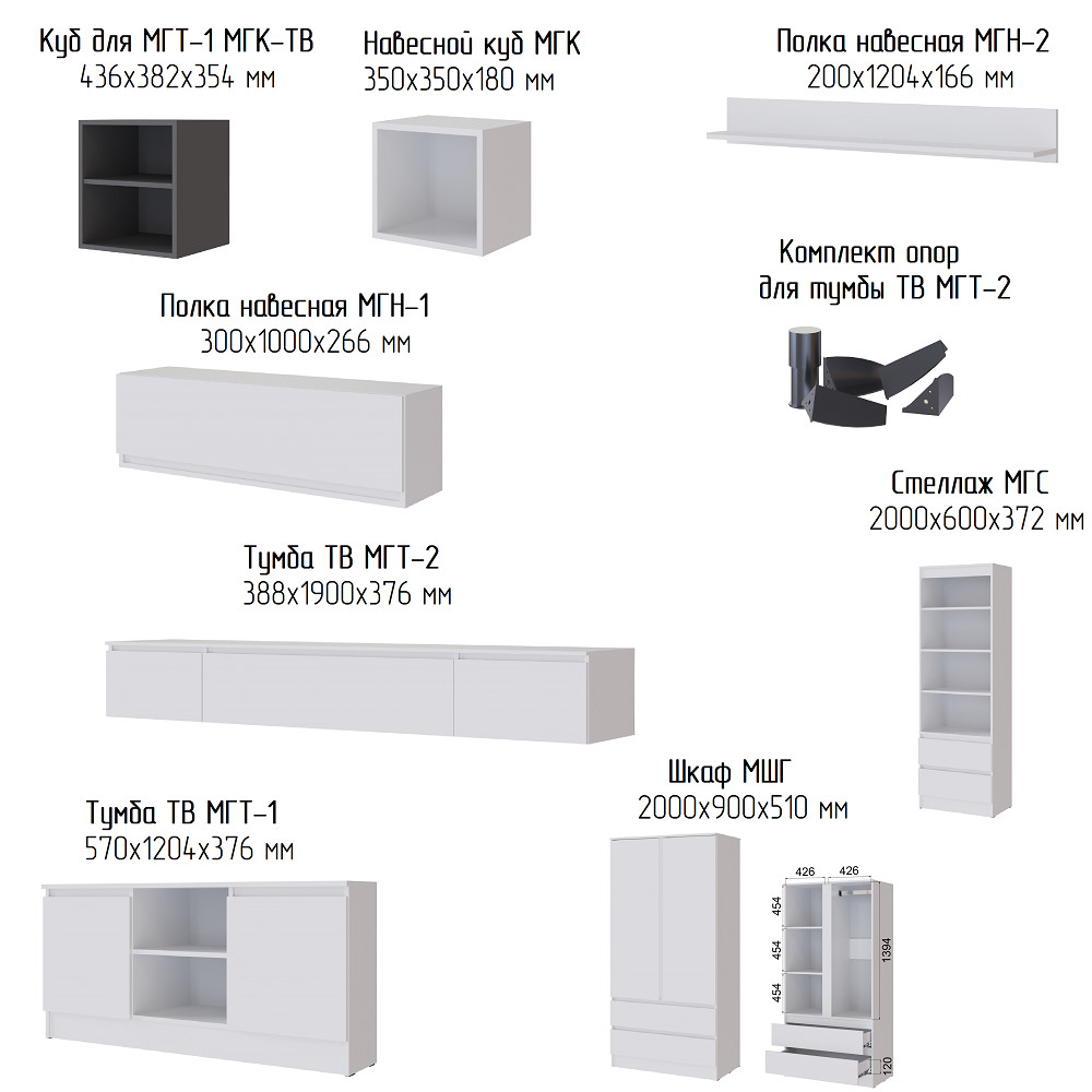 Цена за комплект: МГН-1 Шкаф навесной, МГТ-2 Тумба ТВ, МГК Куб навесной (2шт), МГК Куб навесной графит (2шт)