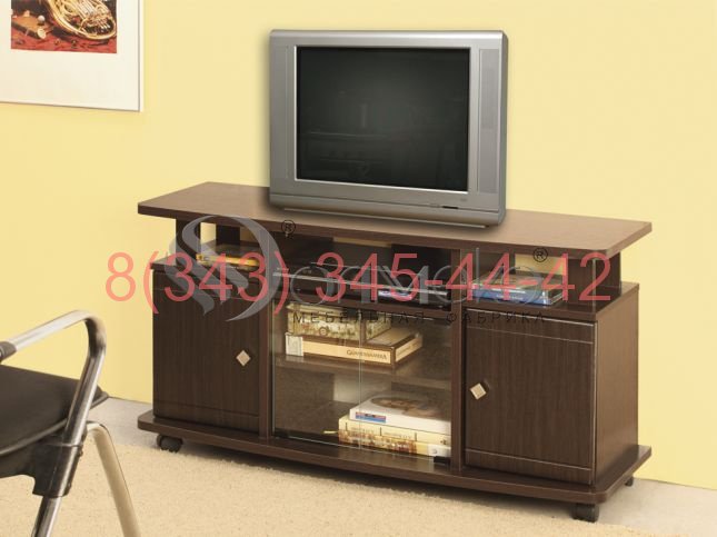 Вместительная тумба под ТВ с отделениями, закрытыми распашными дверьми по бокам. Внутри каждого - одна полка. Посередине - закрытая распашными стеклянными дверьми секция с одной полкой. Сверху - три открытые ниши.
