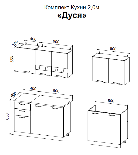 - Верхние шкафы: в 556 мм; г (корпус+фасад) 300 мм;