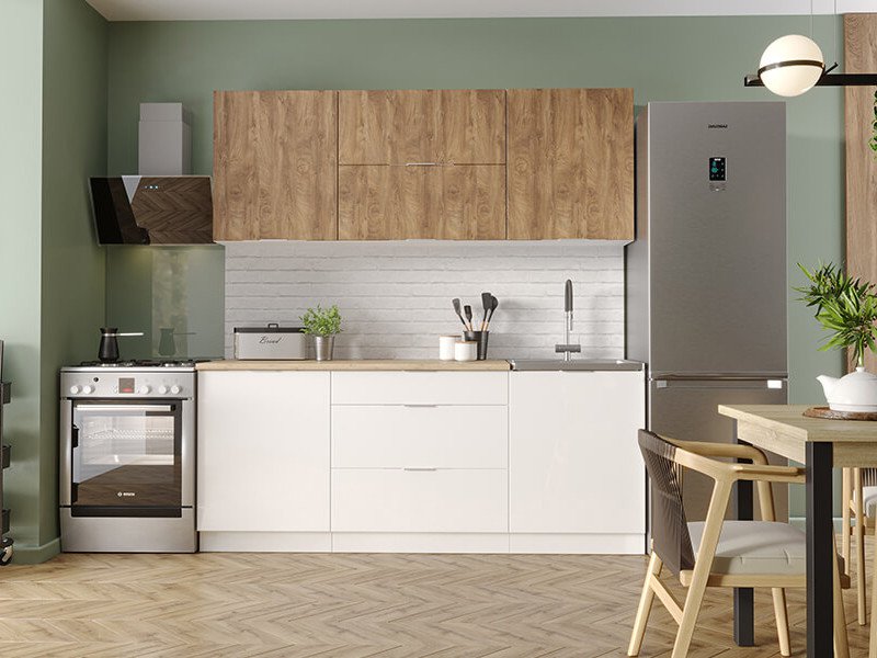 - Фасад: МДФ + пленка ПВХ (шкафы настенные - "Лиственница охотская", шкаф-столы кухонные - "Белый глянец"