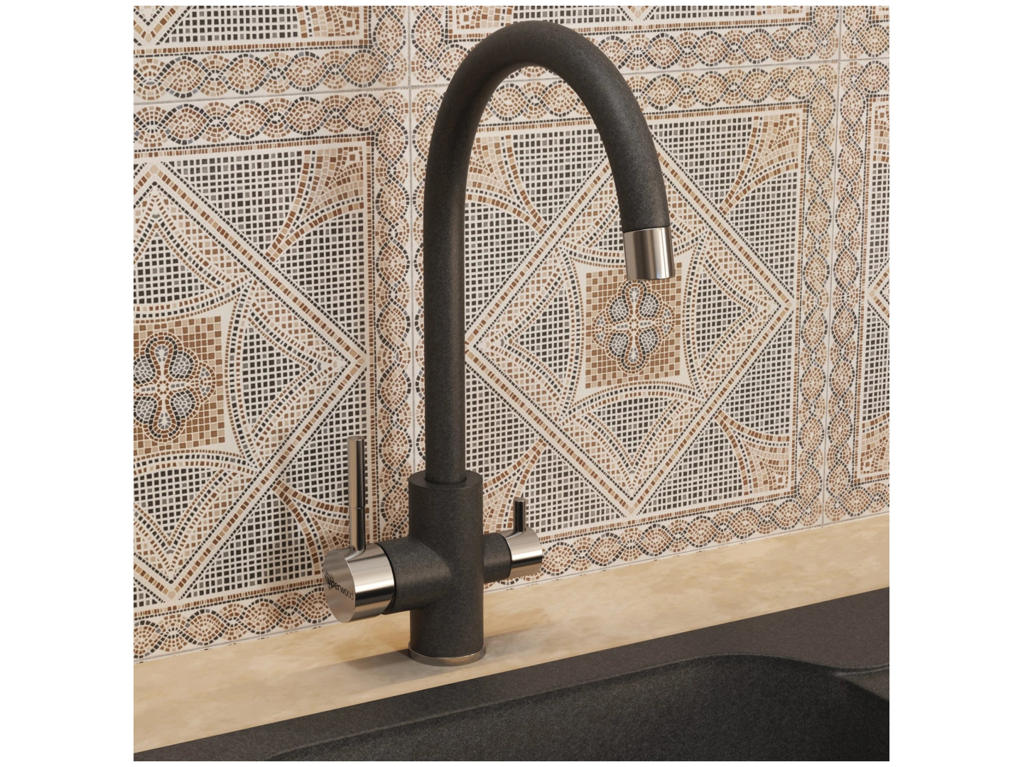 Смеситель оснащен встроенным фильтром для питьевой воды и дополнительной рукояткой с рычажным управлением. Высокий поворотный излив. Современный дизайн изделия. Гибкая подводка 45 см в комплекте. Усиленная гайка крепления смесителя.