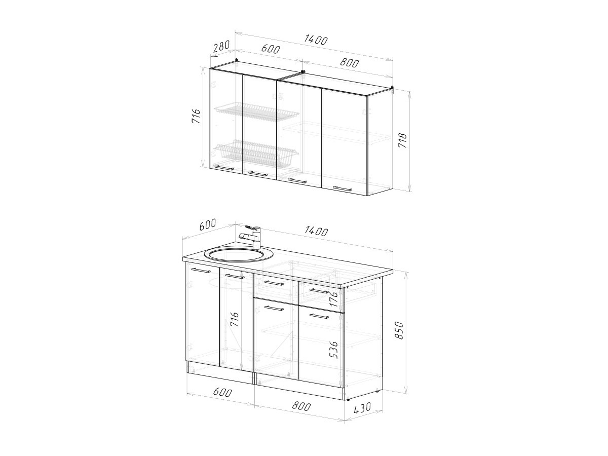 Мойка, смеситель, стеновая панель и посудосушитель в комплект гарнитура не входят.