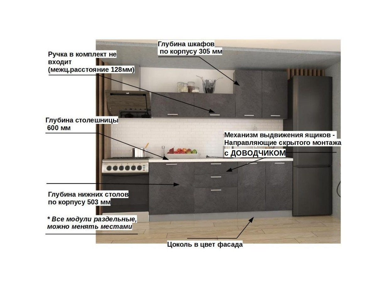 Кухонная мойка, стеновая панель, посудосушитель, планки для столешницы в комплект не входят.