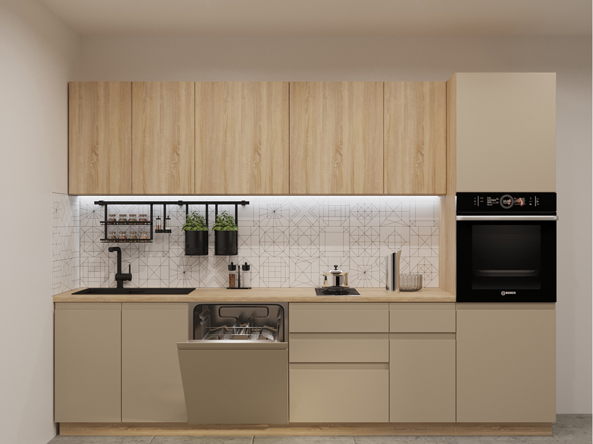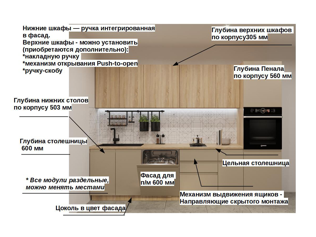 Кухонная мойка, стеновая панель, посудосушитель, планки для столешницы в комплект не входят.