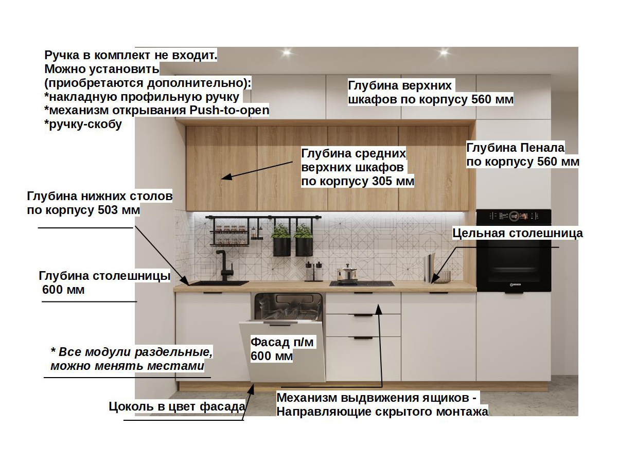 Кухонная мойка, стеновая панель, посудосушитель, планки для столешницы в комплект не входят.