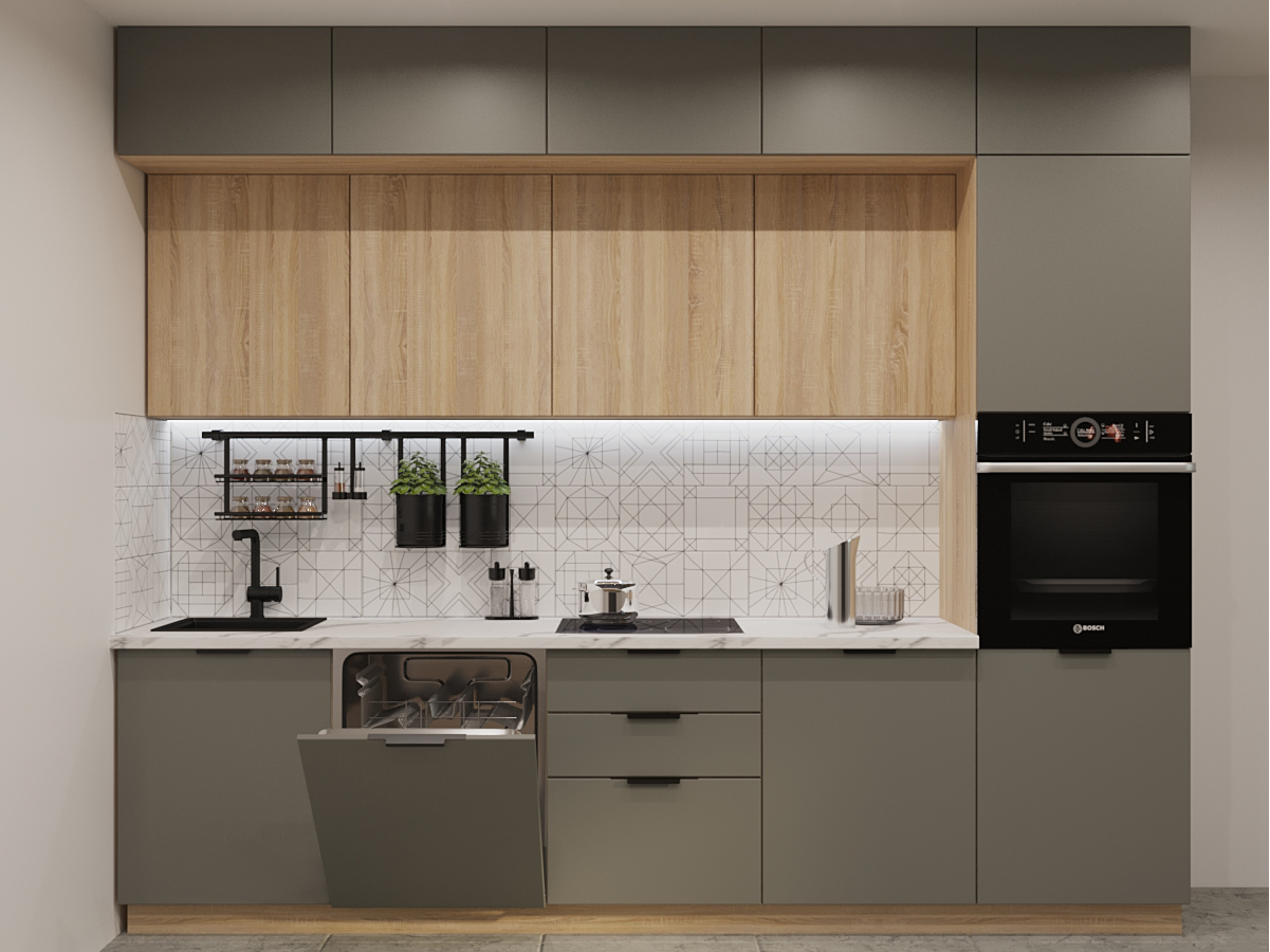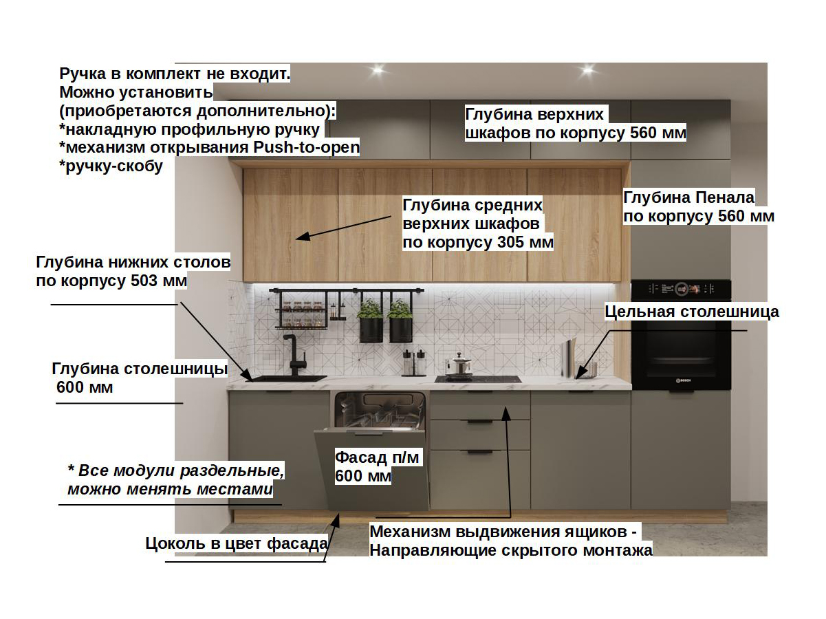 Кухонная мойка, стеновая панель, посудосушитель, планки для столешницы в комплект не входят.