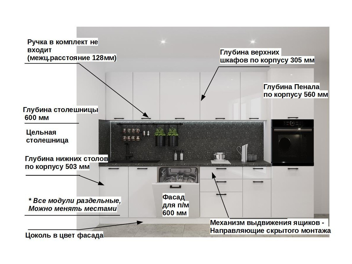 Кухонная мойка, стеновая панель, посудосушитель, планки для столешницы в комплект не входят.