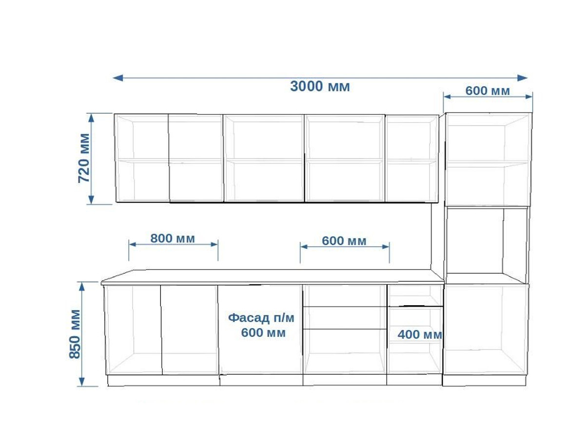 - высота верхних шкафов 720 мм