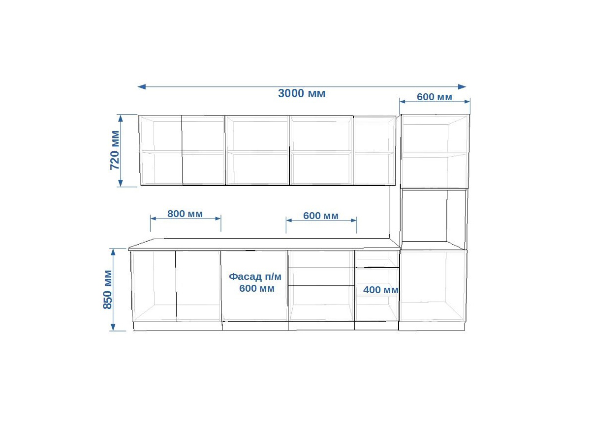 Кухонная мойка, стеновая панель, посудосушитель, планки для столешницы в комплект не входят.
