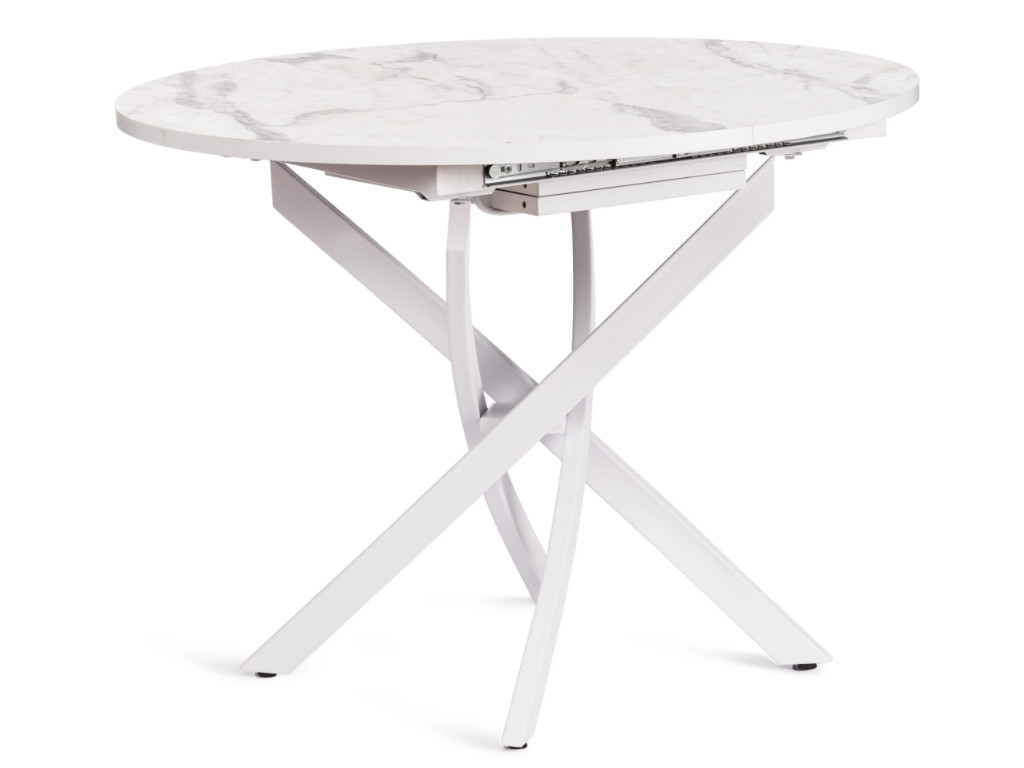 Столешница цвета Мрамор светлый и вставка «бабочка» выполнены из ЛДСП толщиной 22 мм на лицевую поверхность которых нанесен защитный слой HPL толщиной 1 мм. HPL имеет защитное покрытие оверлей высокой степени истирания, которое повышает устойчивость поверхностей к повреждениям. Механизм раздвижения синхронный со вставкой "бабочка". Кромка столешницы оклеена высокопрочной пленкой из ПВХ толщиной 2 мм. Каркас стола выполнен из ЛДСП толщиной 16 мм. Стильные изогнутые металлические ножки окрашены порошковой краской. Устойчивые ножки стола регулируются по высоте для устранения неровности пола. За столом могут разместиться от 2 до 6 человек. Стол прост в сборке, инструкция по сборке прилагается.