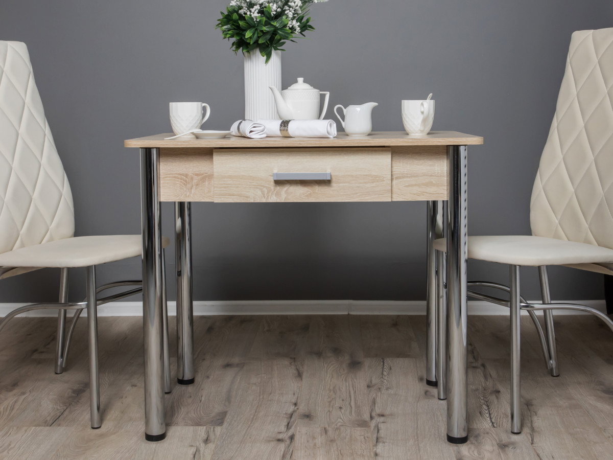 - Компактный стол, с выдвижным ящиком для столовых приборов или кухонных принадлежностей, подойдет даже для небольшой квартиры.