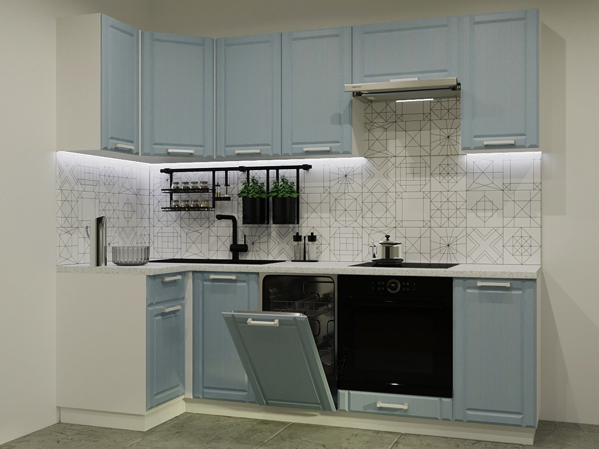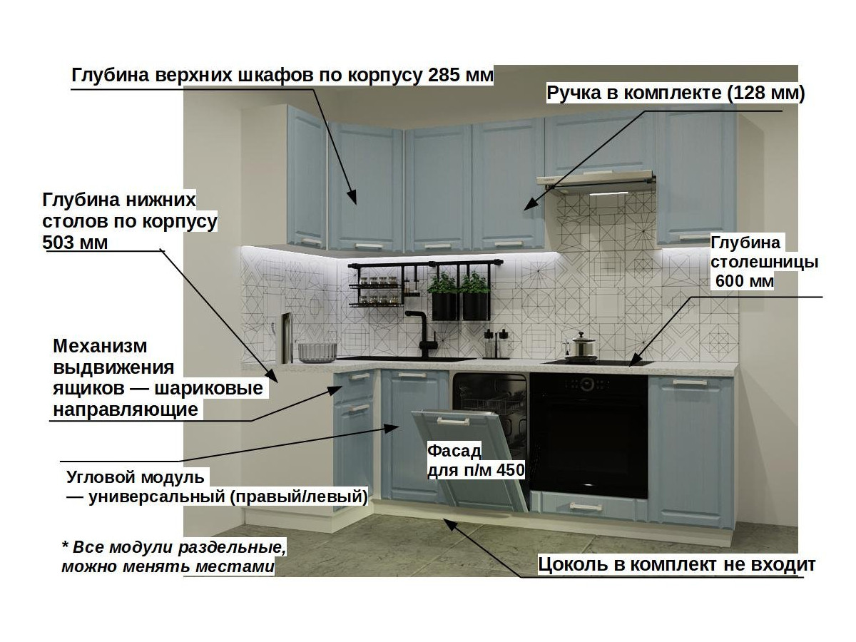 Кухонная мойка, стеновая панель, посудосушитель, планки для столешницы в комплект не входят.
