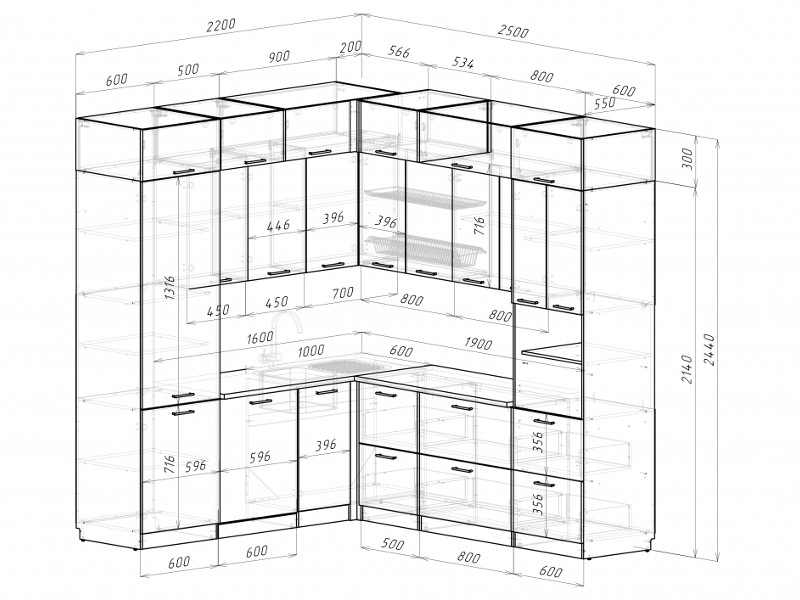Мойка, смеситель, стеновая панель и посудосушитель в комплект гарнитура не входят.