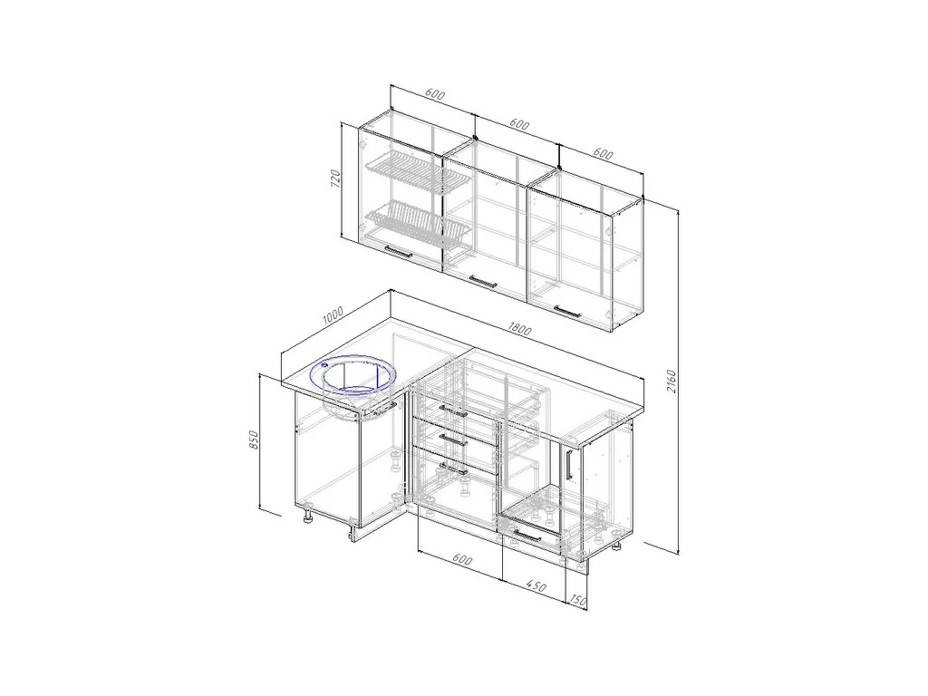 Ширина кухни: 1800х1000 мм