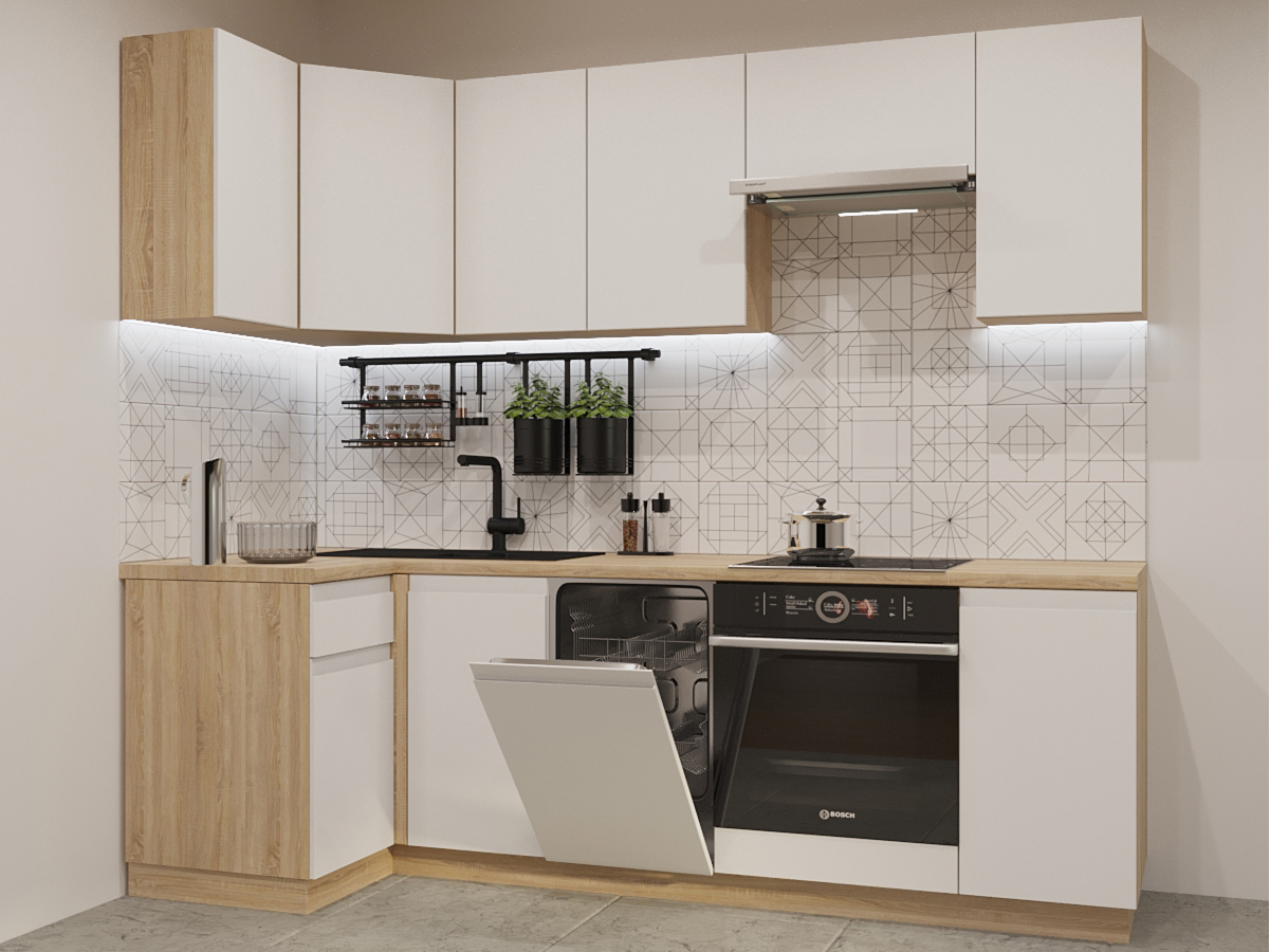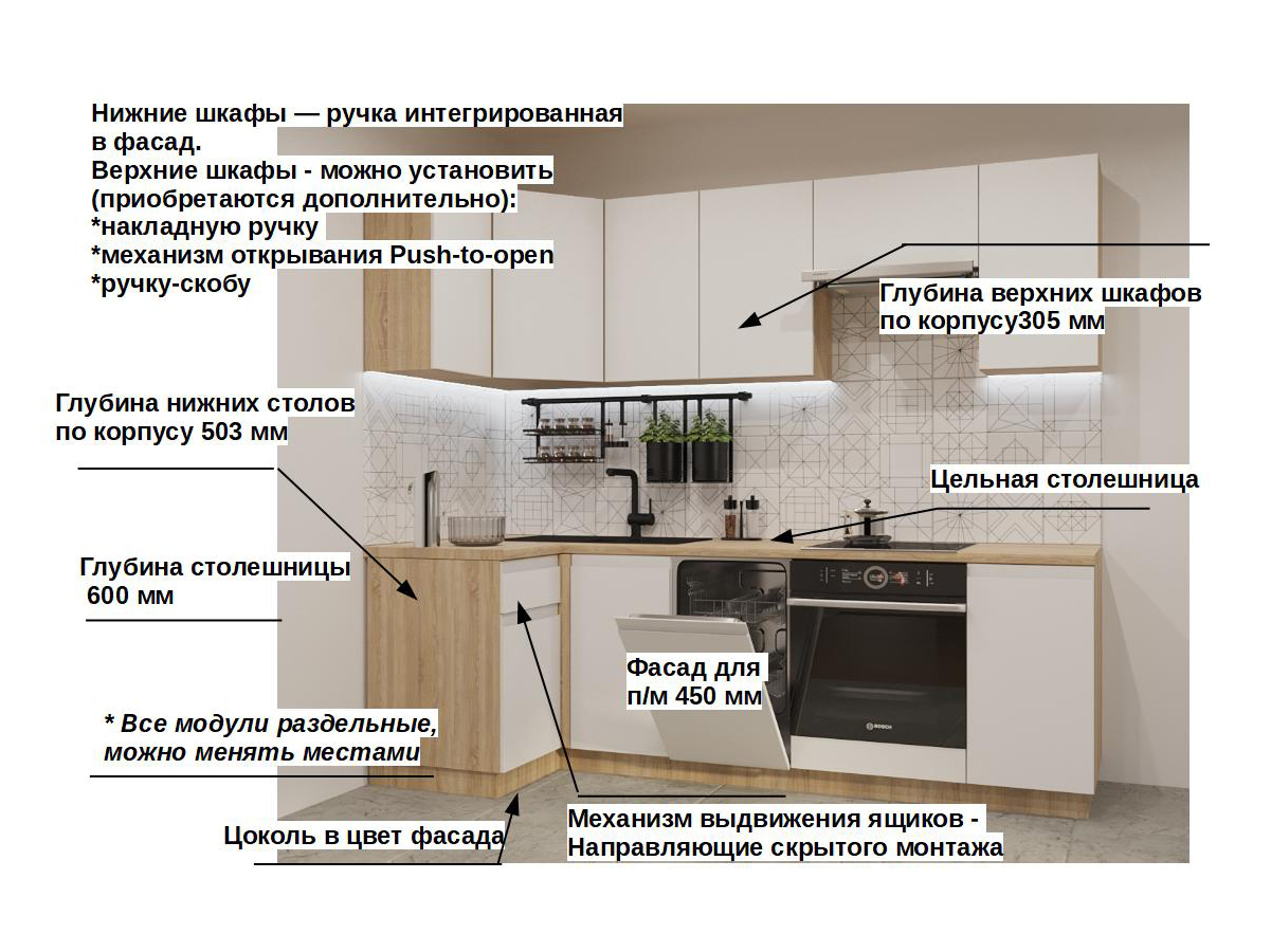Кухонная мойка, стеновая панель, посудосушитель, планки для столешницы в комплект не входят.
