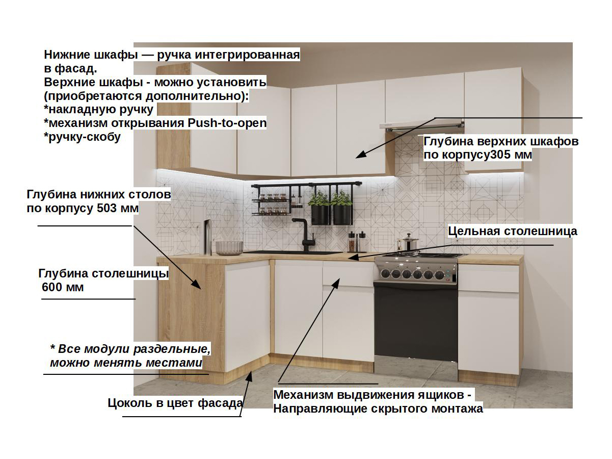 Кухонная мойка, стеновая панель, посудосушитель, планки для столешницы в комплект не входят.
