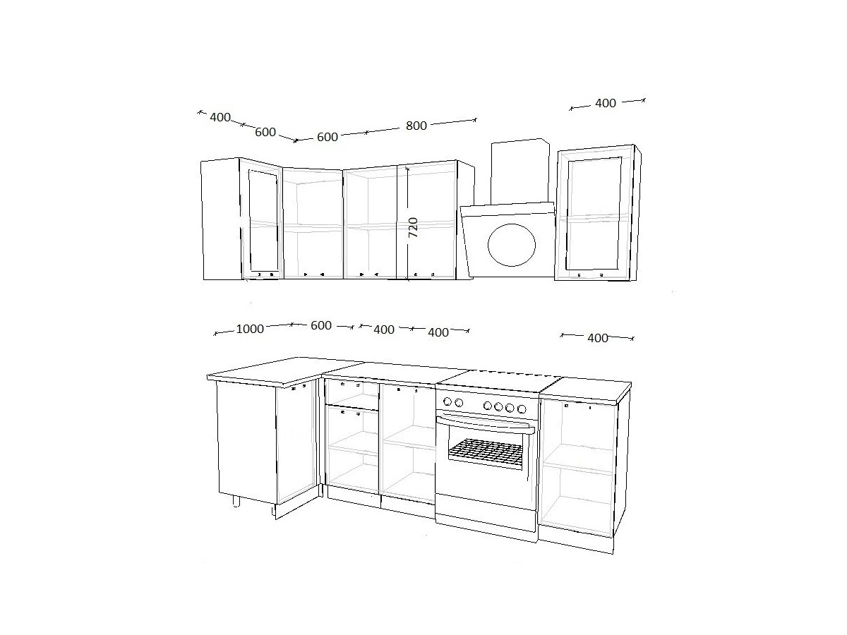 Кухонная мойка, стеновая панель, посудосушитель, планки для столешницы в комплект не входят.