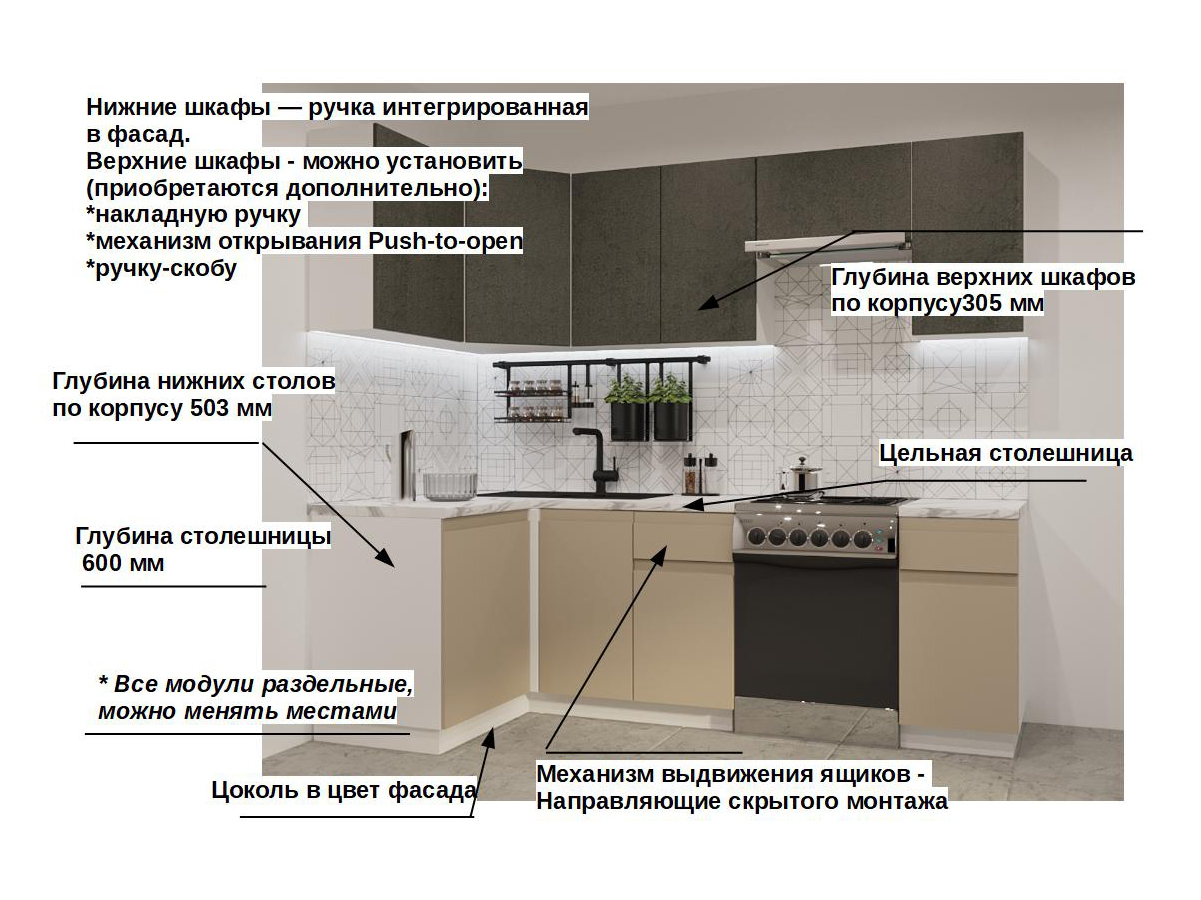 Кухонная мойка, стеновая панель, посудосушитель, планки для столешницы в комплект не входят.