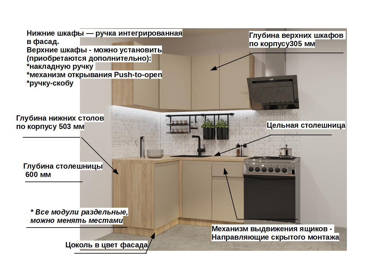 Кухонная мойка, стеновая панель, посудосушитель, планки для столешницы в комплект не входят.