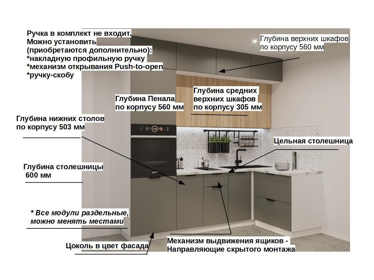 Кухонная мойка, стеновая панель, посудосушитель, планки для столешницы в комплект не входят.