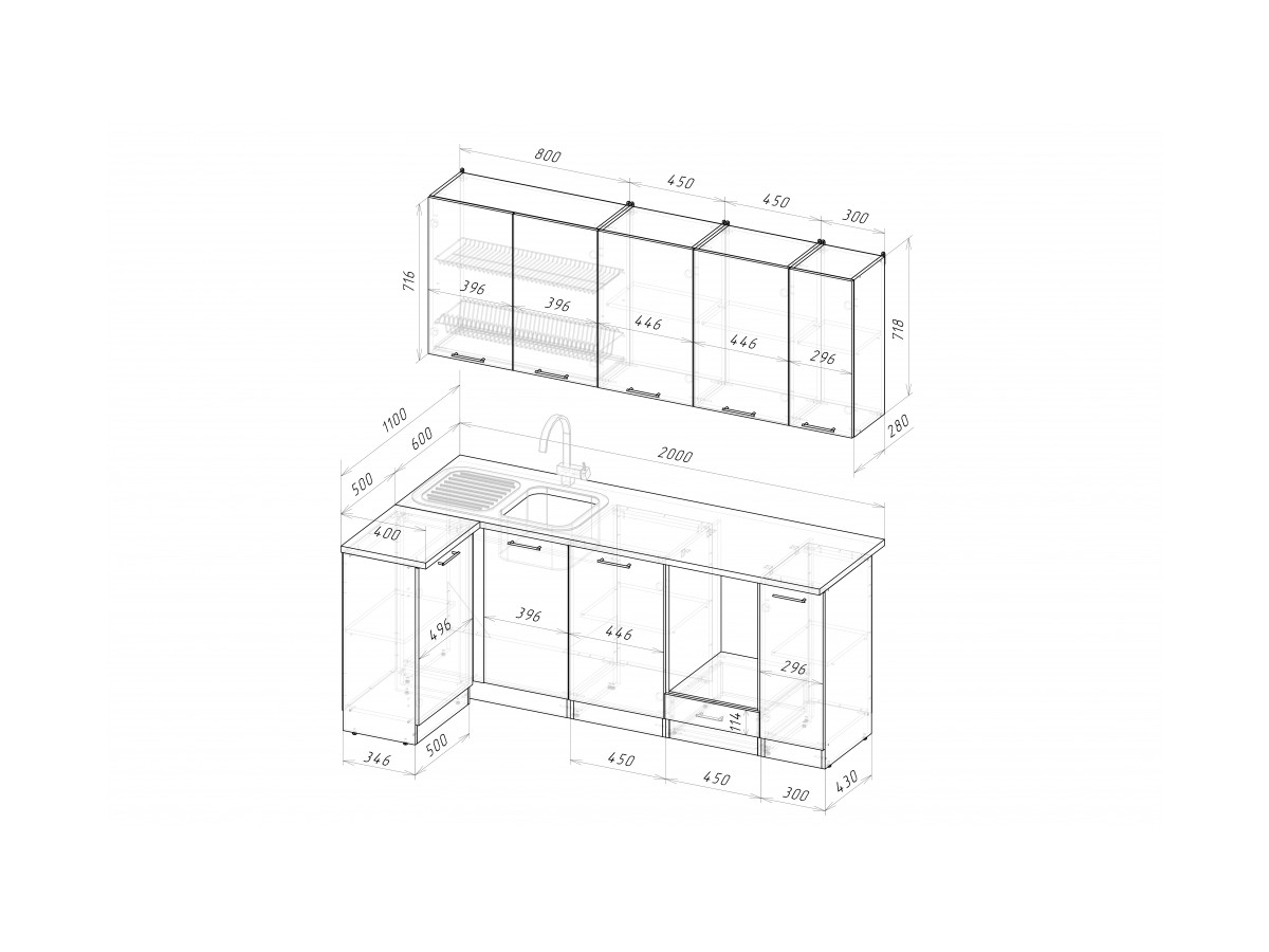 Мойка, смеситель, стеновая панель и посудосушитель в комплект гарнитура не входят.