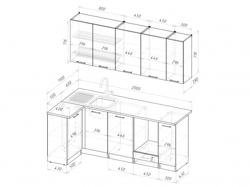 Мойка, смеситель, стеновая панель и посудосушитель в комплект гарнитура не входят.