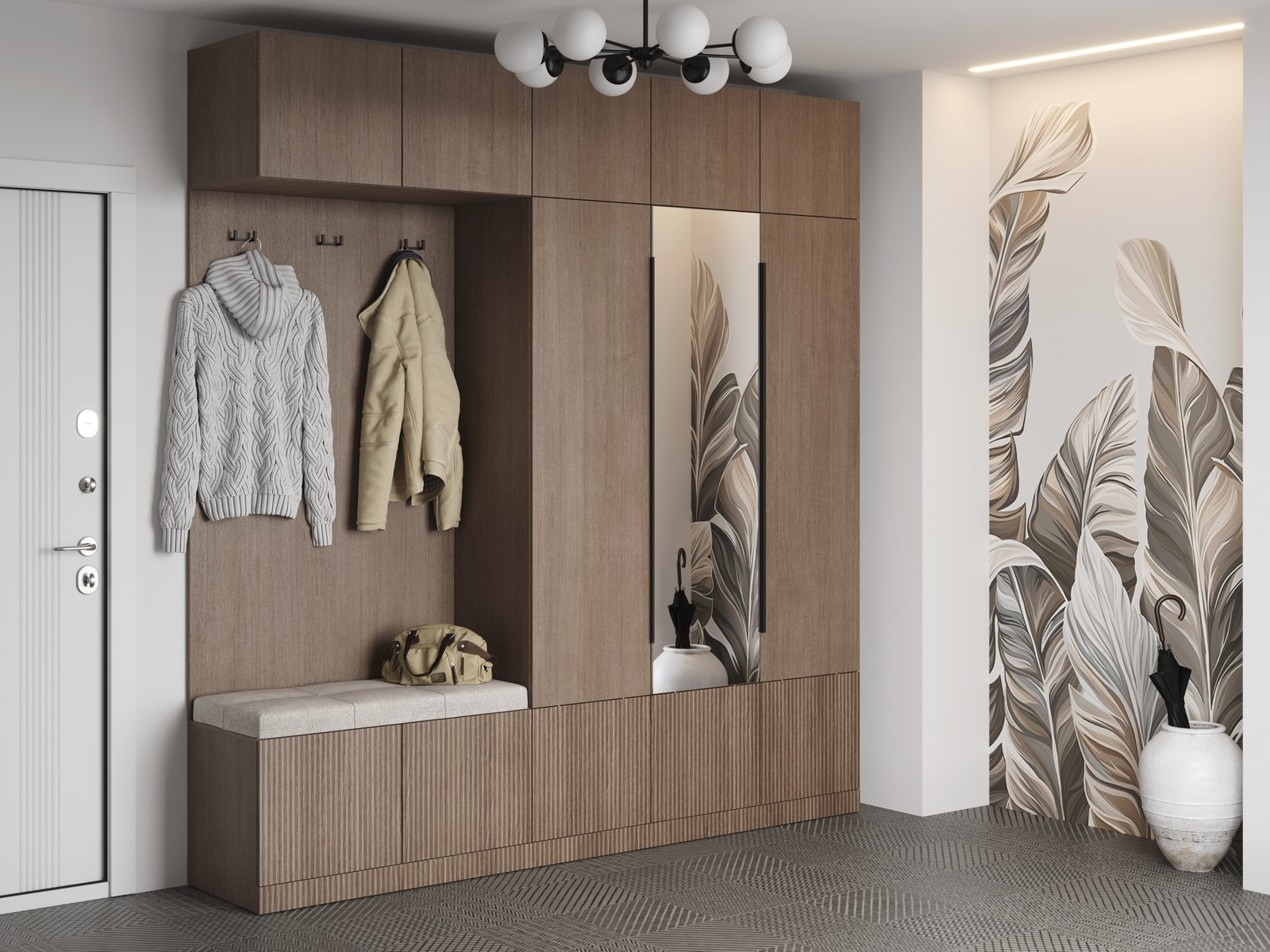 Фасады этой части без ручек - в цвет корпуса ЛДСП, открываются при помощи толкателей для дверей.