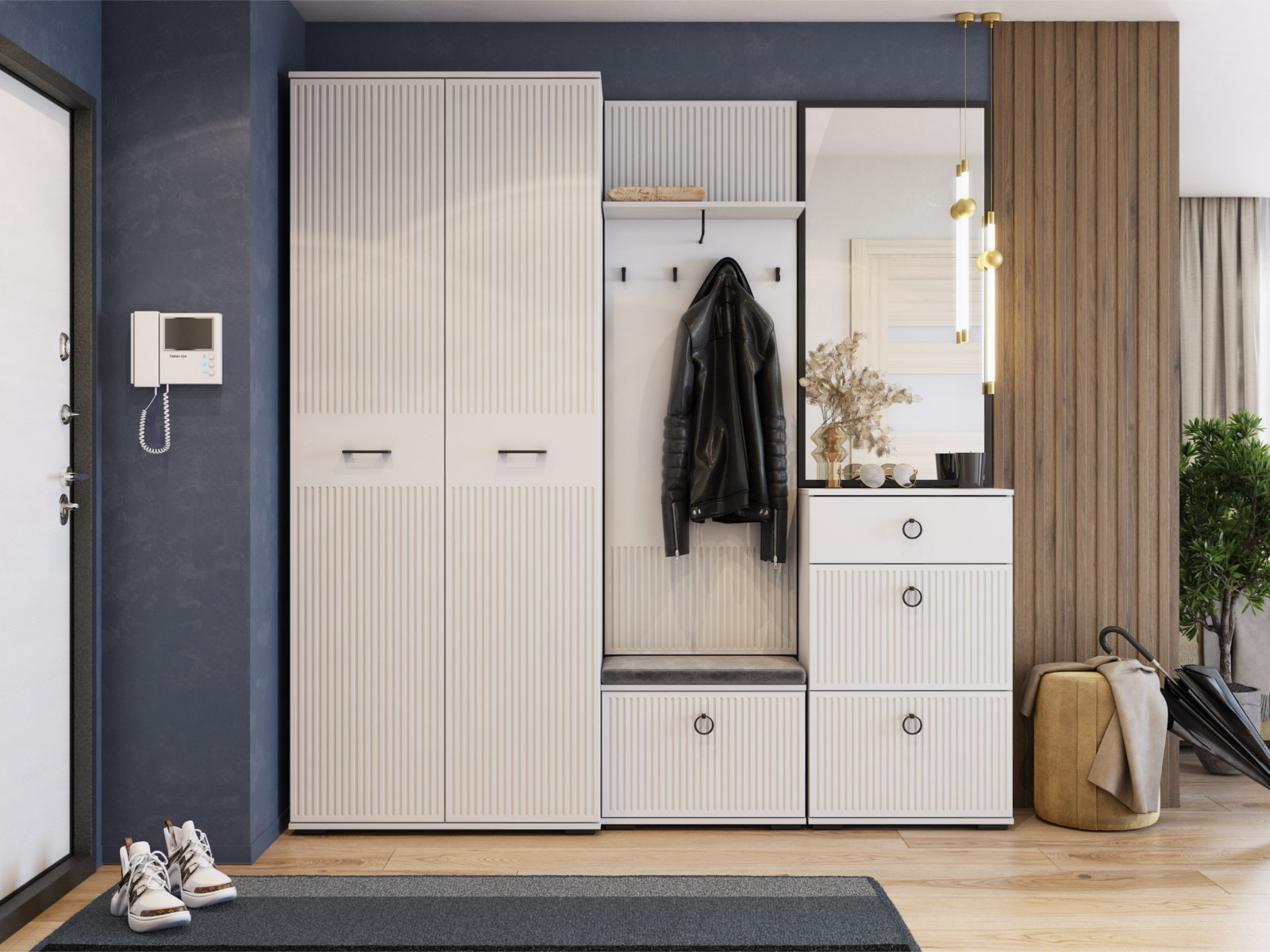 Цена за комплект: Шкаф угловой, Шкаф 1 дв. для платья и белья, Вешалка под плечики и крючки, Тумба с мягким элементом и ящиком, Обувница, Зеркало настенное в профиле черный (900)