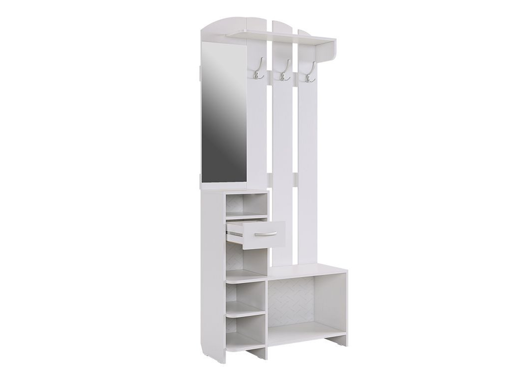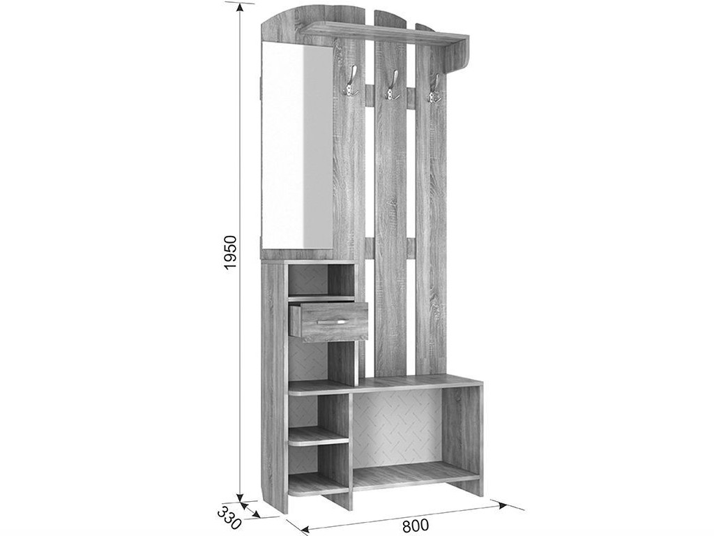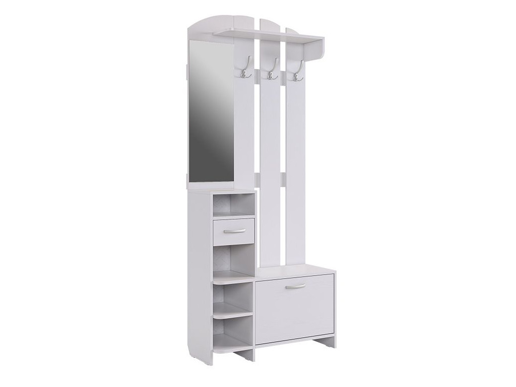 Состоит из: полок, вешалки с крючками для одежды и сумок, обувницы, открытых полок, зеркала, полки для головных уборов, выдвижного ящика. Сборка универсальная.