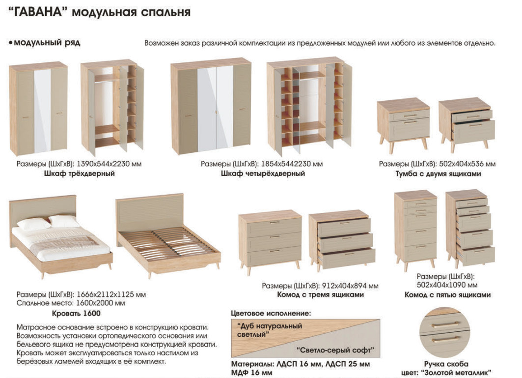 Цена за комплект: шкаф 3 двери,комод 5 ящика, кровать, тумба