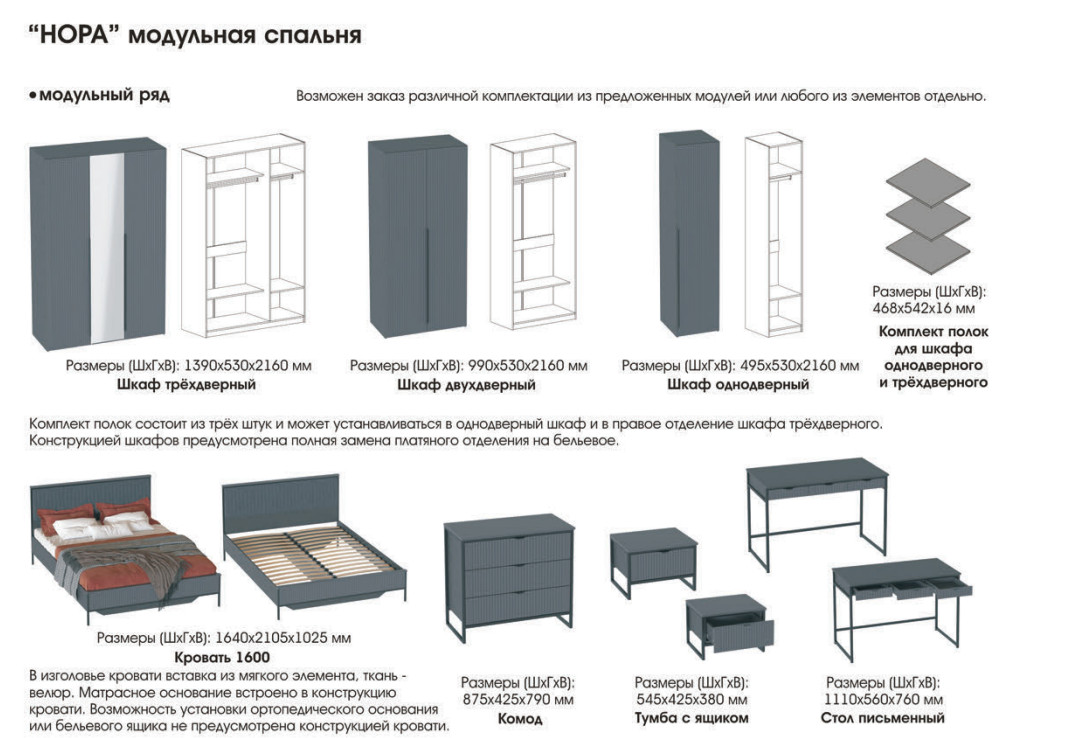 Цена за комплект: Комод, Кровать, Тумба, Шкаф 3 дверный