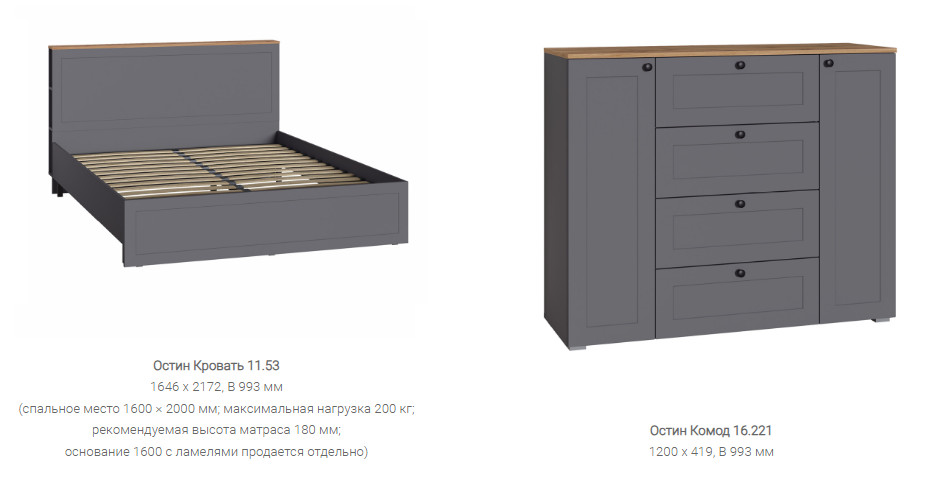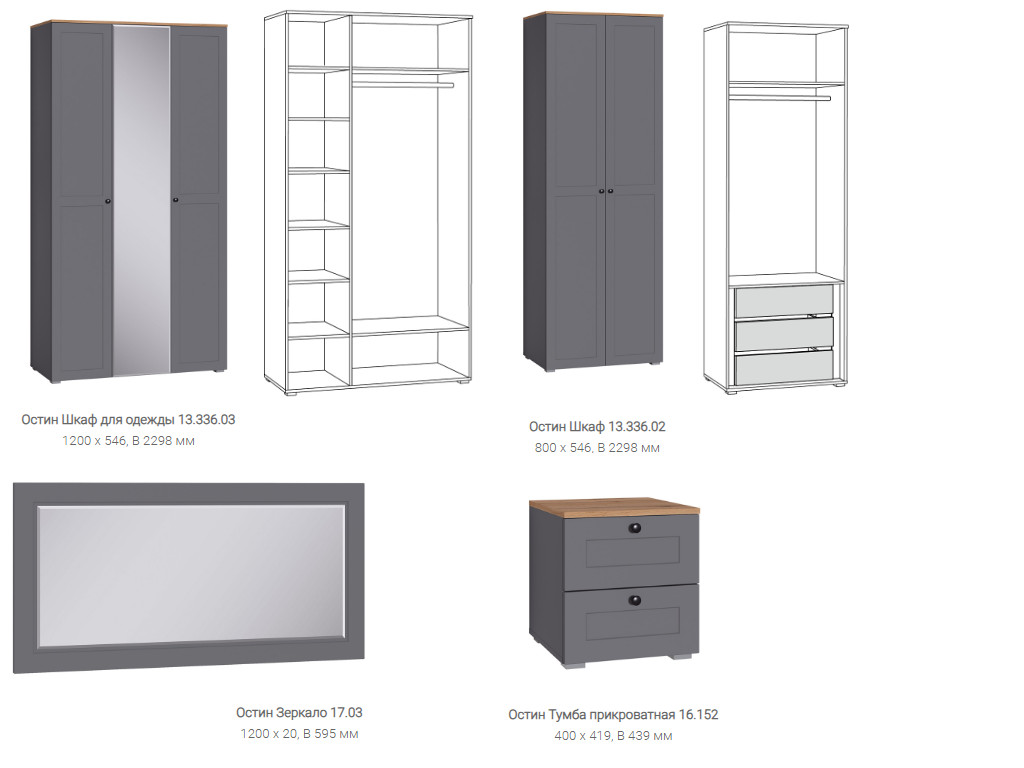 Цена за комплект: Кровать 11.53, Тумба прикроватная 16.152, Шкаф для одежды 13.336.02, Шкаф для одежды 13.336.03