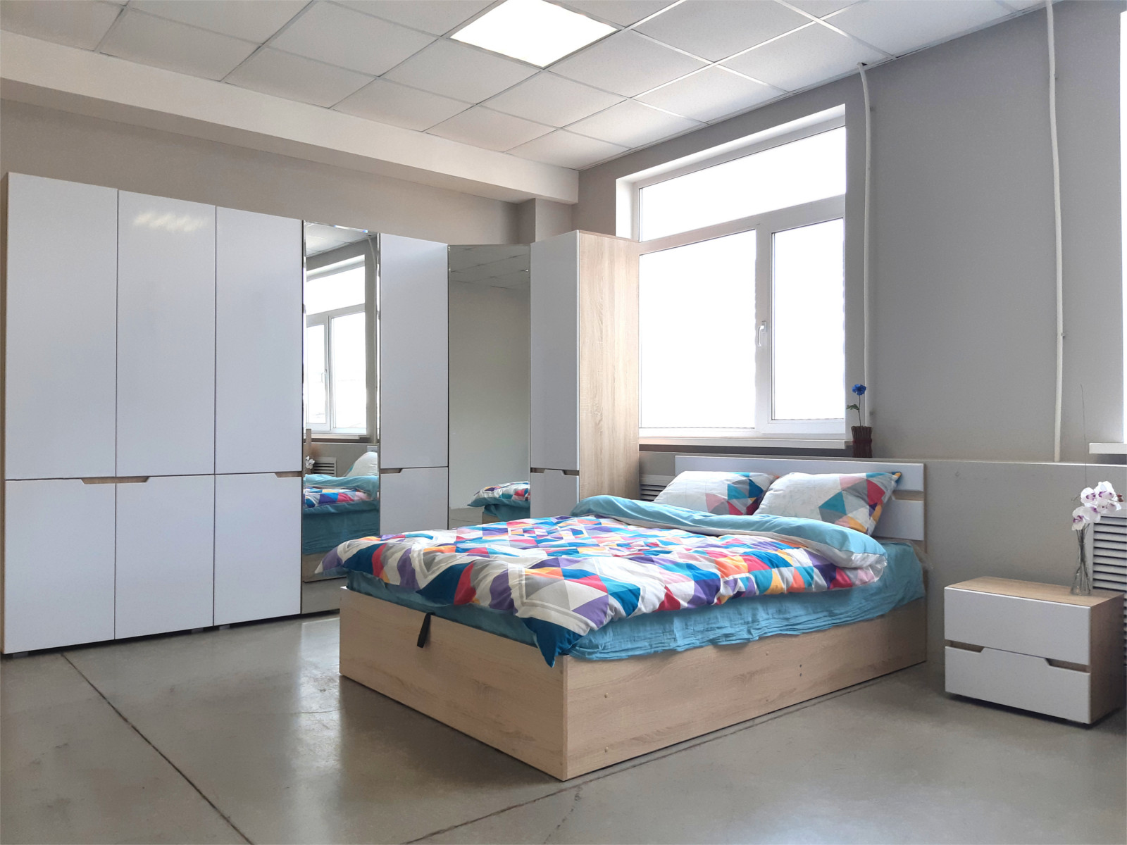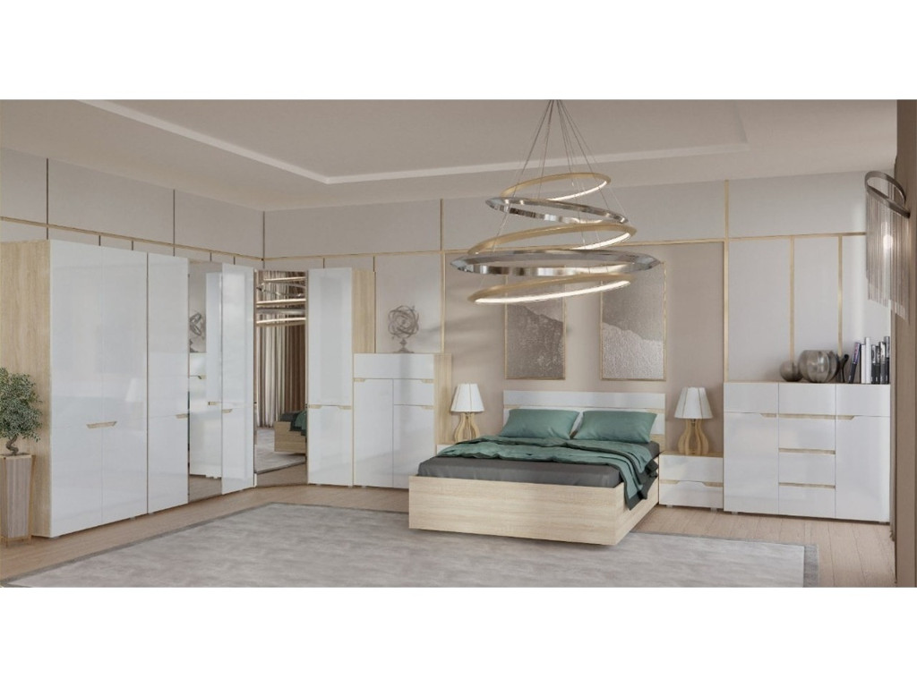 Состав комплекта: шкаф 2-х створчатый, шкаф 3-х створчатый, шкаф угловой, пенал , комод-800, тумба прикроватная (2шт), комод-1200, кровать-1400, основание 1400, опоры для основания