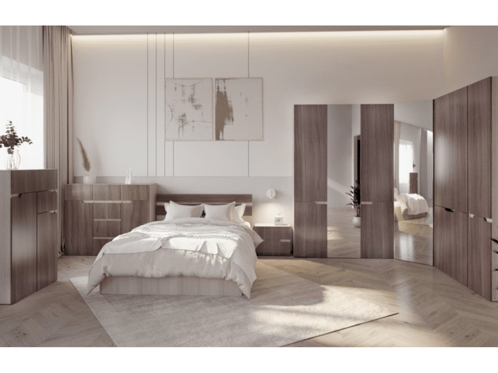 Состав комплекта: шкаф 2-х створчатый, шкаф 3-х створчатый, шкаф угловой, пенал , комод-800, тумба прикроватная, комод-1200, кровать-1400, основание 1400, опоры для основания