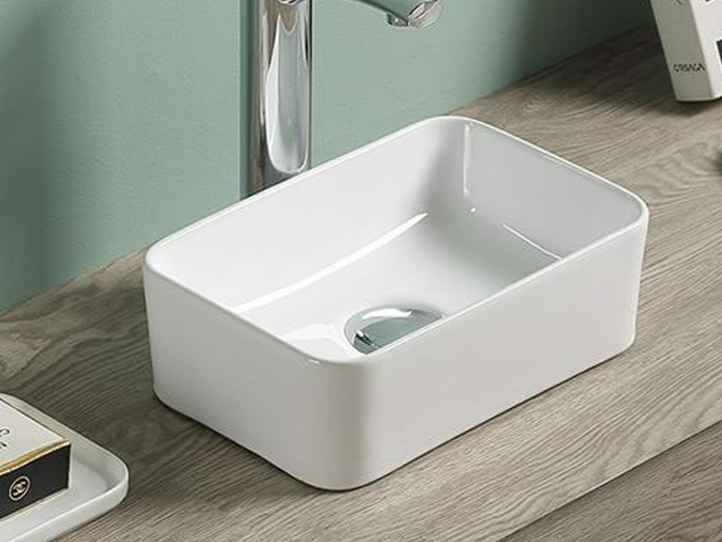 Белая накладная раковина на столешницу прямоугольной формы.