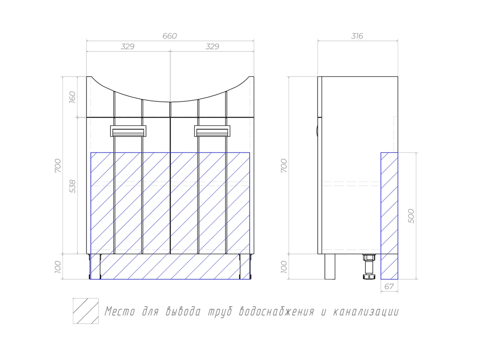 Оснащение: 2 дверцы; 1 полка ЛДСП; ручка врезная металлическая хромированная, опоры квадратные регулируемые.