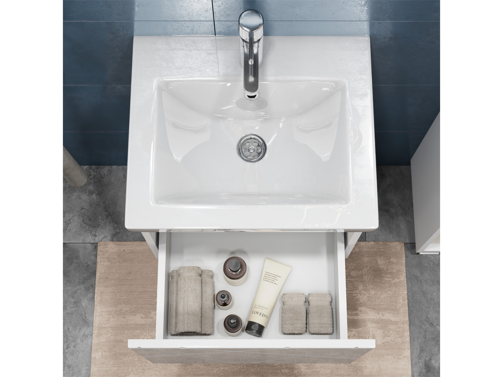 Оснащение: 1 выдвижной ящик, направляющие скрытого монтажа, открывание нажатием "push-to-open", 2 навеса, 1 сифон
